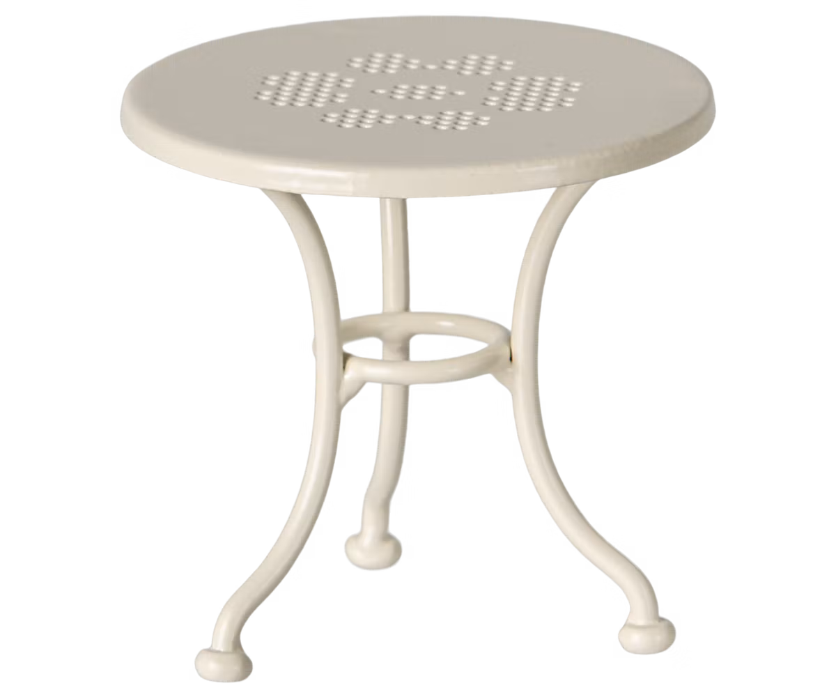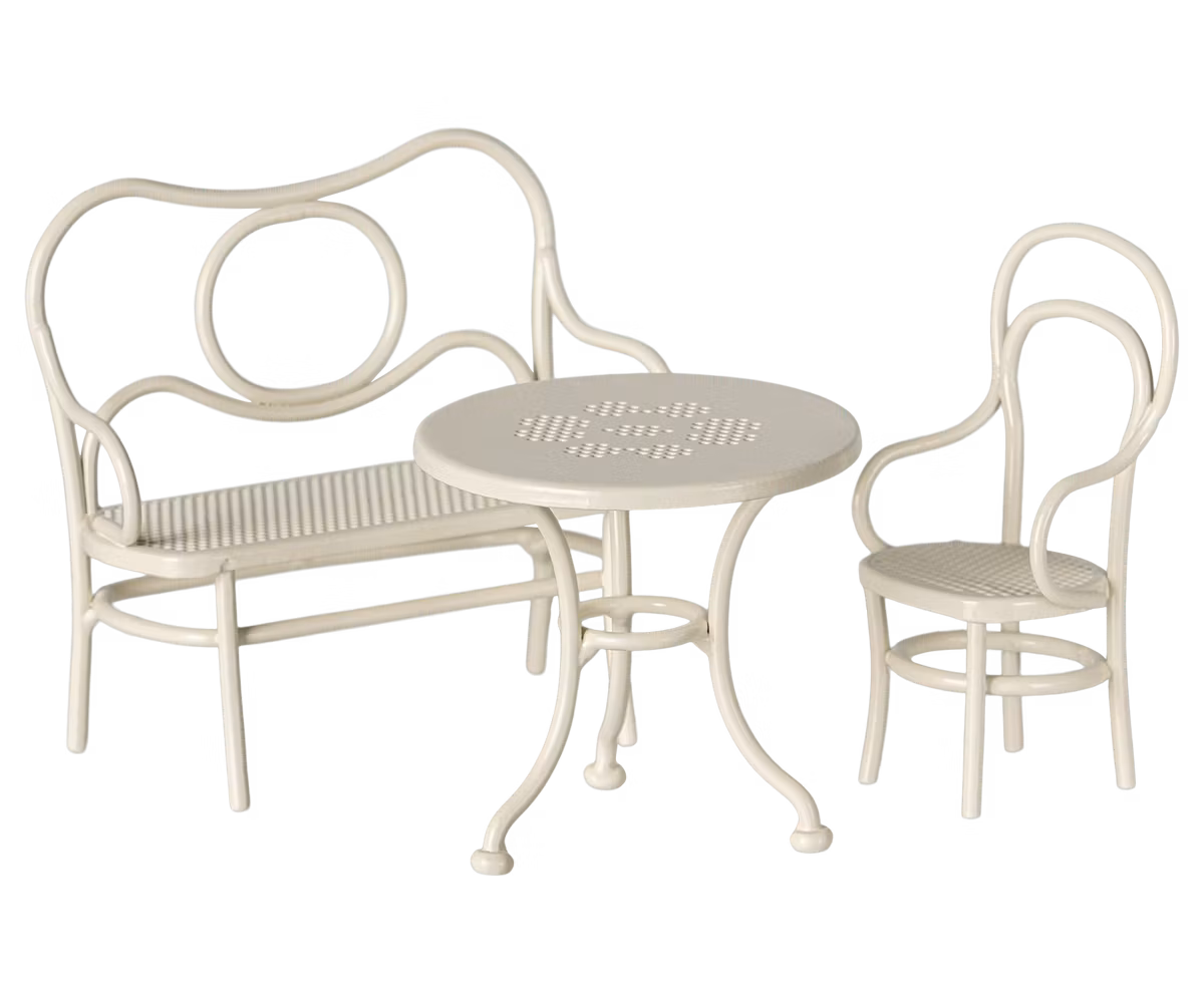 Et cafésæt i miniformat, der passer til Lillesøster/Lillebror og Storesøster/Storebror Mus. Sættet består af en bænk, en stol og et bord – det perfekte sted at nyde eftermiddagens lækkerier sammen. Et utroligt detaljerigt og håndlavet produkt fra det populære firma Maileg.