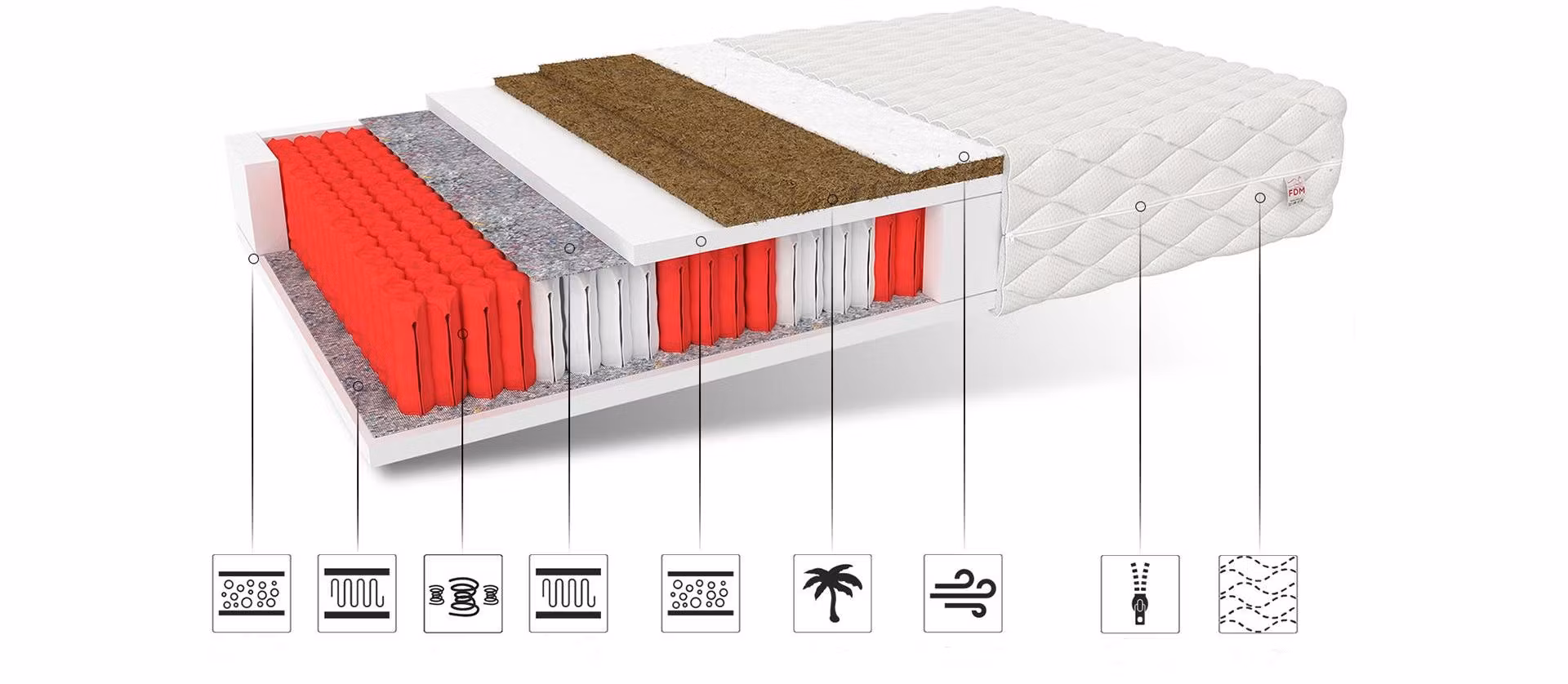 Materiale: polyurethanskum T25, kokosfibre og individuelle pocketfjedre. Vaskeanvisninger: betræk kan vaskes i maskine ved 30° C.