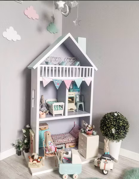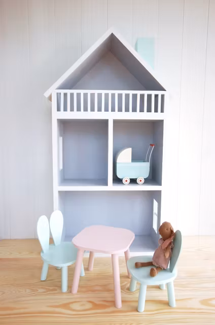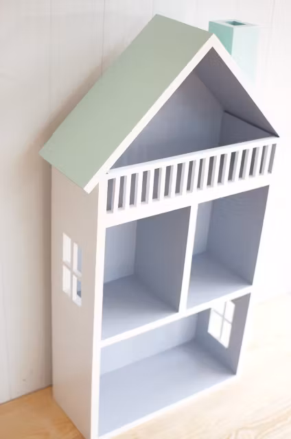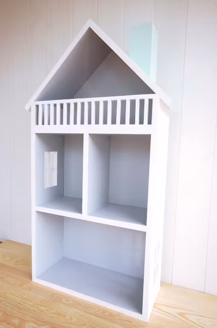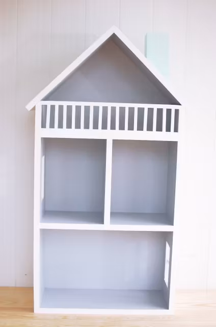 Et stort og flot dukkehus med vinduer og gelænder. Et dukkehus i generationer, der aldrig går ud af tiden.