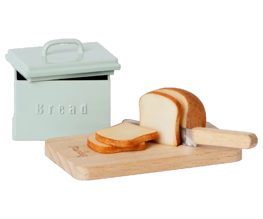Du skal have noget mad inde i dukkehuset, ikke? Med denne fantastiske brødkasse går ingen sultne om morgenen. Yderst detaljeret produkt fra det populære danske firma Maileg. Sættet indeholder: - brødkasse - skærebræt - kniv. - et halvt brød og tre skiver brød. Alder: Fra 3 år. Mål: 4 x 8 cm Materialer: Metal, træ, polyresin.
