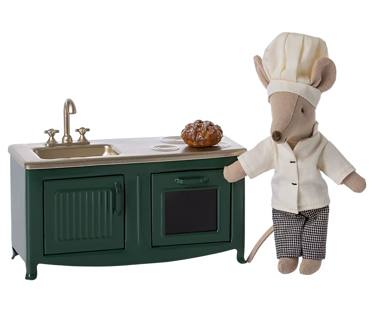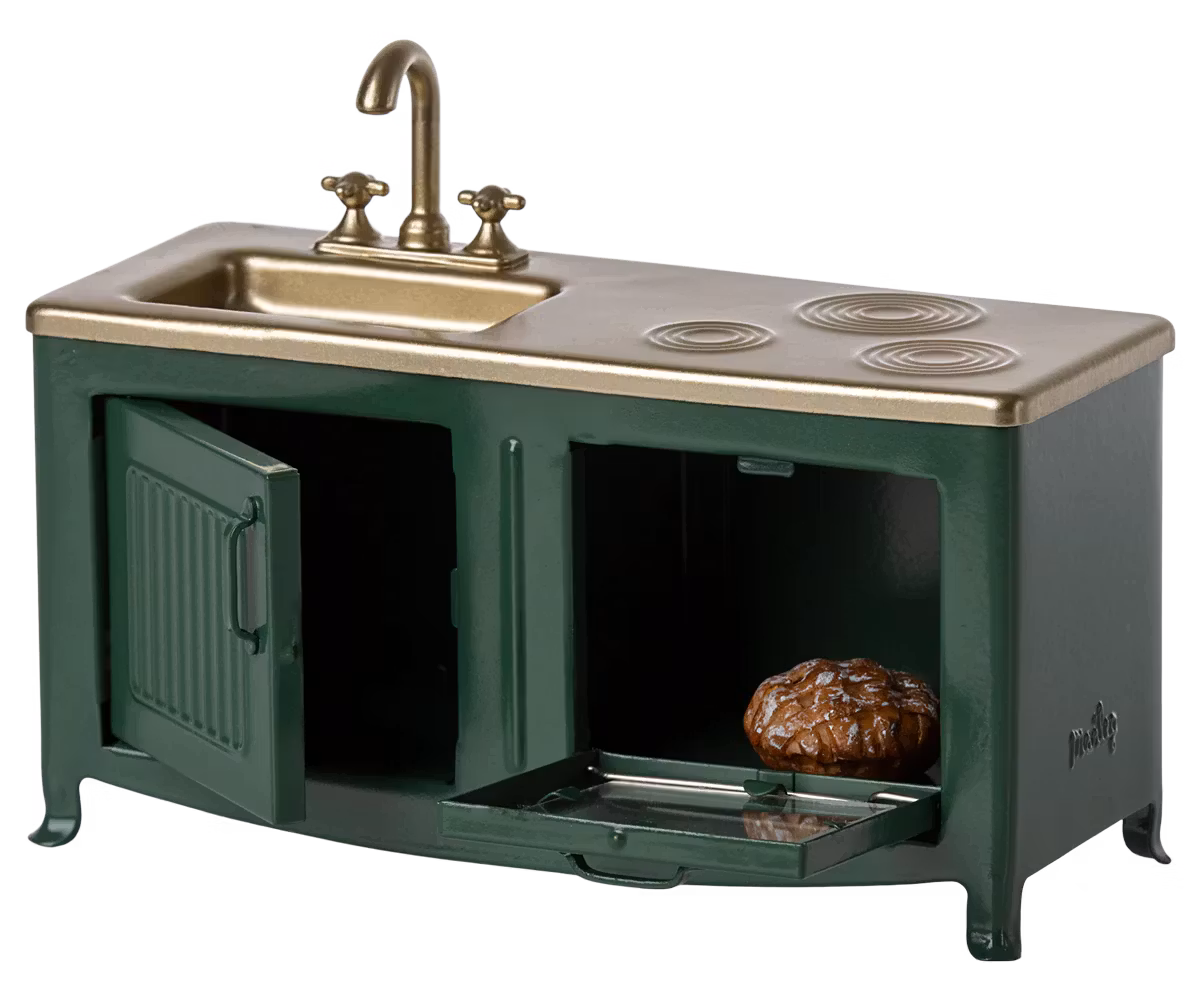 Hvis du vil lave god mad, skal du have et godt køkken. Dette er et meget detaljeret produkt med alt det tilbehør, du kan komme i tanke om. Derudover er den lavet i hånden af rigtige kunstnere. En friskbagt tærte medfølger. Mål: 7,5 cm x 14 cm, 5,5 cm Alder: Fra 3 år. Materiale: Metal.