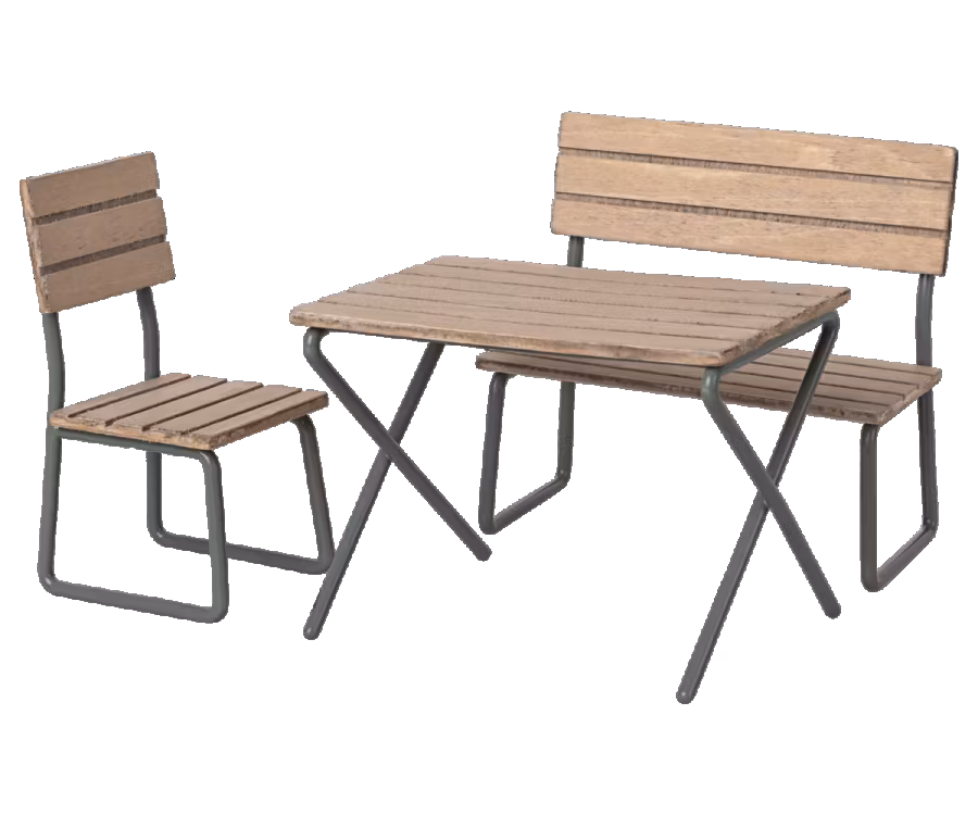 Lækkert møbelsæt bestående af bord, bænk og stol fra det populære danske Maileg. Perfekt til at sidde og nyde en smuk solnedgang på altanen eller i haven. Alder: Fra 3 år. Mål: 9 x 8,5 cm Materialer: Metal/Træ