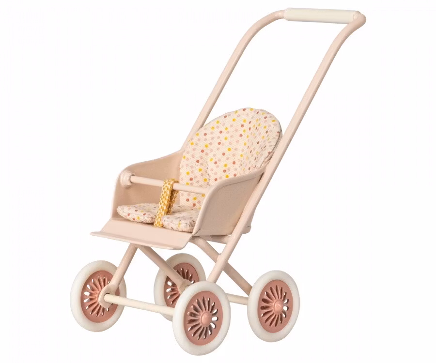 Super fin vintage barnevogn til Mailegs fineste venner. Dukkevognen er lavet af metal med et fint mønster på sædehynden. Mål: 13 cm Materialer: Metal, bomuld og gummi.