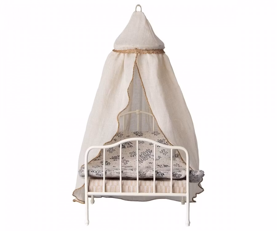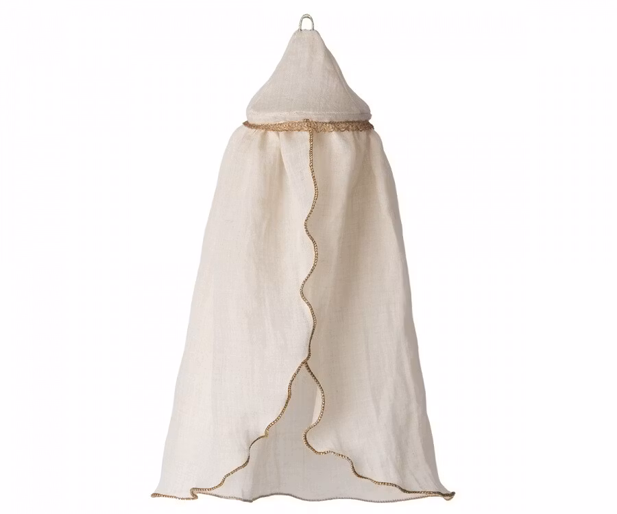 En romantisk sengehimmel til Miniature dukkehuset fra danske Maileg. Sengehimmelen hænges nemt op fra soveværelsesloftet med en lille krog, der følger med. Mål: Højde: 32 cm. Bredde 8 cm. Materiale: Bomuld/metal.