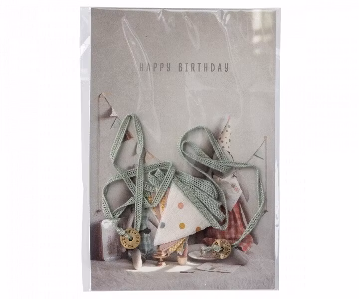 En smuk vimpel til dukkehuset fra danske Maileg. Passer perfekt i stuen, eller når det er tid til fødselsdag i miniaturedukkehuset! Mål: Længde: 85 cm. I alt 7 vimpler. Materiale: Bomuld