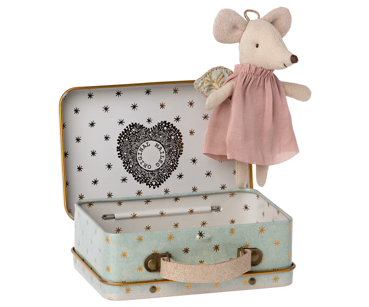 Maileg, museengel i en kuffert kr 136 kr 122 Produktet er desværre udsolgt. :( Information Anmeldelser En sød museengel en lille kuffert. Mål: 7x11 cm Alder: 0-3 år. Materialer: Metal/Bomuld/Polyester/Polyurethan Vaskeanvisning: 30 grader