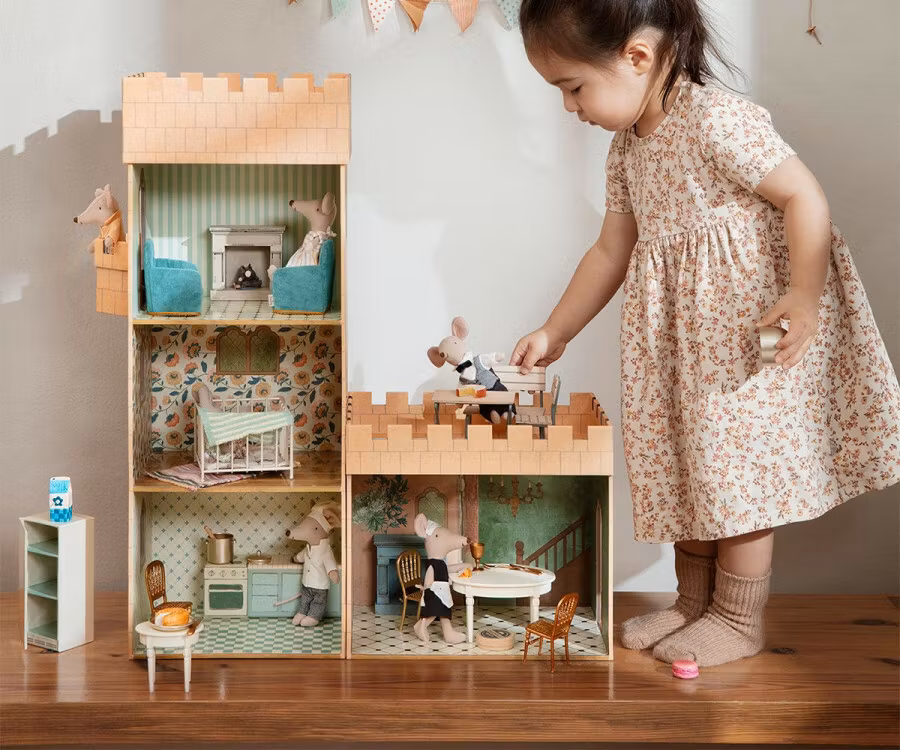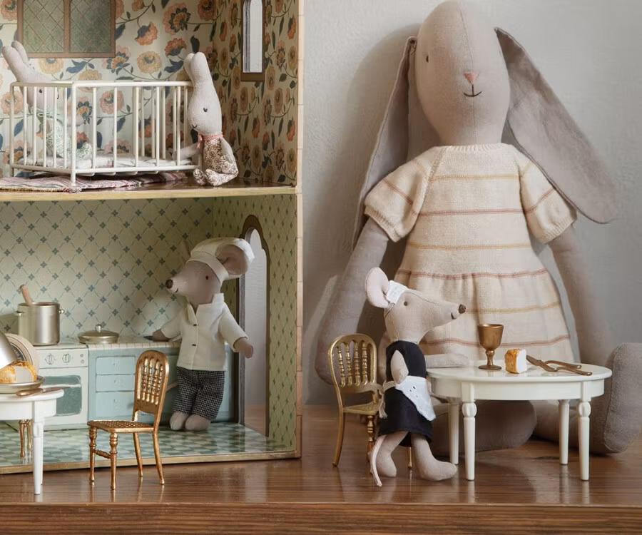 Middagstid, og med dette fantastiske køkkenbord til dukkehuset bliver det en sand fornøjelse. Holdet på tre i flot vintage stil. Utroligt detaljeret produkt fuldstændig håndlavet af det populære firma Maileg. Højde: 7 cm. Bredde: 12 cm. Alder: Fra 3 år Materialer: Træ