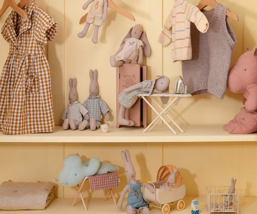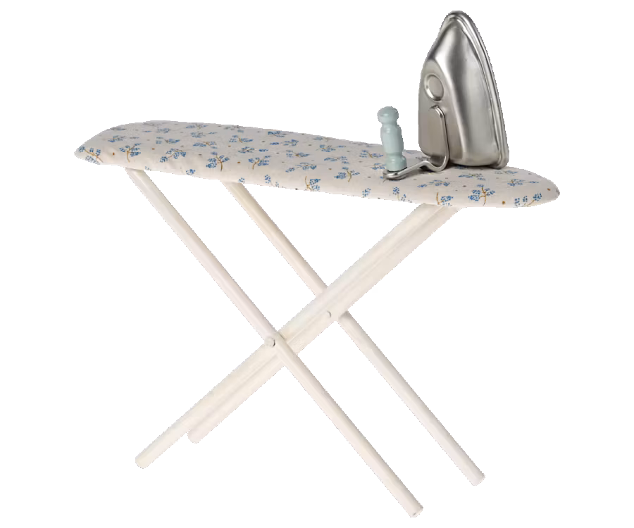 Selvfølgelig skal selv de mindste kunne stryge deres tøj, så dette fantastiske strygebræt med det tilhørende strygejern skaber en skøn stemning i dukkehuset. Utroligt detaljeret produkt fuldstændig håndlavet af det populære firma Maileg. Alder: Fra 3 år. Mål: 13 x 20 cm Materialer: Metal og bomuld.