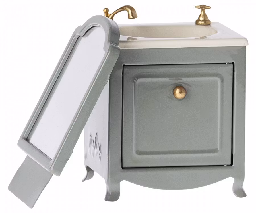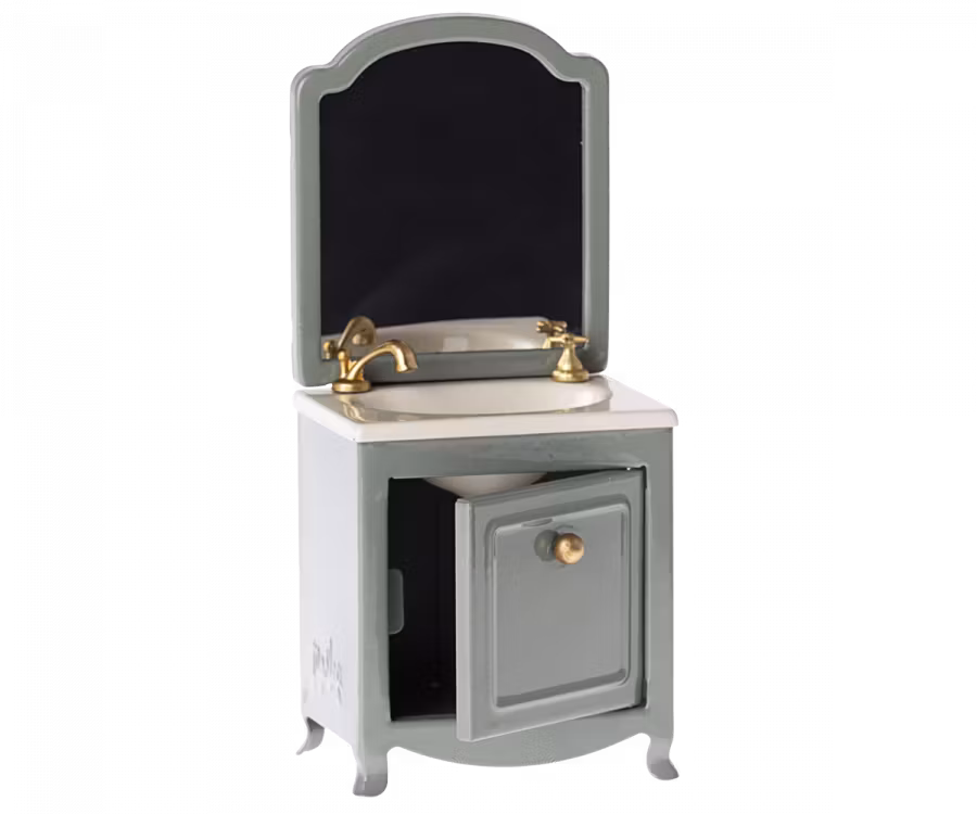 Smuk vask med guldhane til Royal Maileg Slot! Vasken har et aftageligt spejl og et praktisk skab, hvor du kan opbevare et lille håndklæde eller andre ejendele til vores små kongelige. Alder: Fra 3 år. Mål: Højde ca 15 cm. Bredde 6,5 cm. Materiale: Metal.