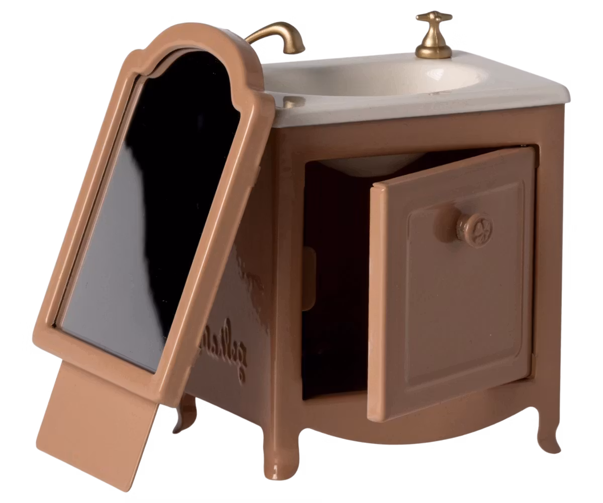 Smuk vask med guldhane til Royal Maileg Slot! Vasken har et aftageligt spejl og et praktisk skab, hvor du kan opbevare et lille håndklæde eller andre ejendele til vores små kongelige. Alder: Fra 3 år. Mål: Højde ca 15 cm. Bredde 6,5 cm. Materiale: Metal.