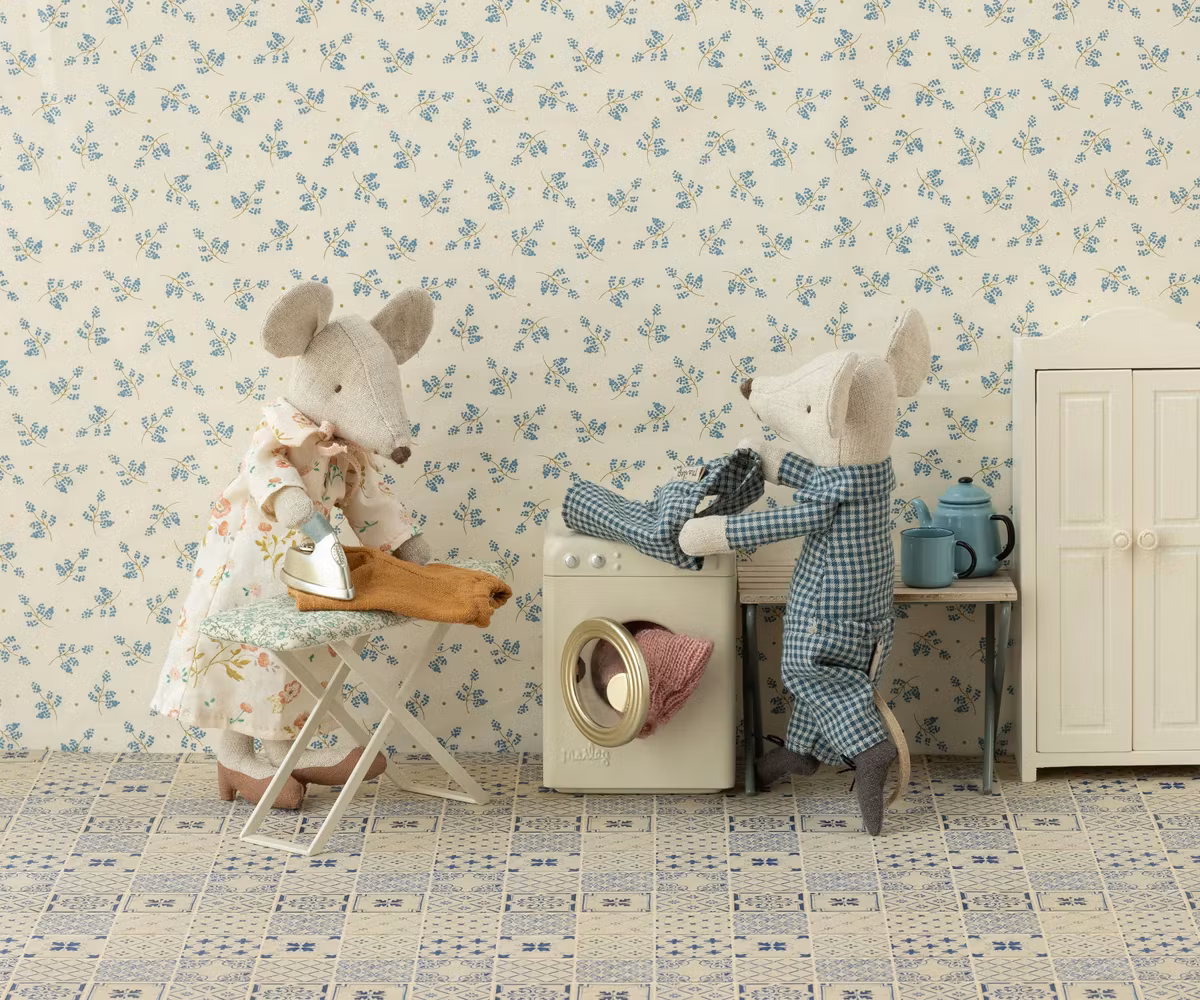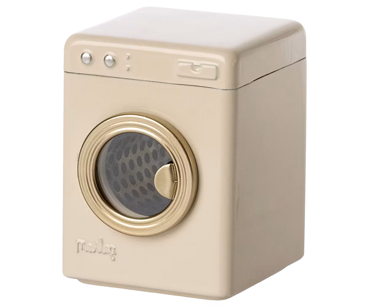 Selv de mindste dukker bliver af og til snavsede, og tøjet skal vaskes. Så er det praktisk at have denne miniature vaskemaskine ved hånden, en helt fantastisk kreation. Utroligt detaljeret produkt fuldstændig håndlavet af det populære firma Maileg. Mål: 6,5 x 8,5 cm Materiale: Metal. Alder: Fra 3 år.