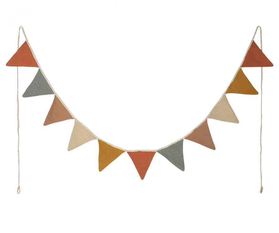 En smuk farverig vimpel fra danske Maileg. Hæng denne bløde vimpel på dit børneværelse for et mere festligt udtryk og eller i et andet rum, hvor du ønsker mere farve. Mål: 300 cm lang, vimpelhøjde 13 cm. Materialer: Bomuld, hør, metaltråde. Kan vaskes ved 30 grader