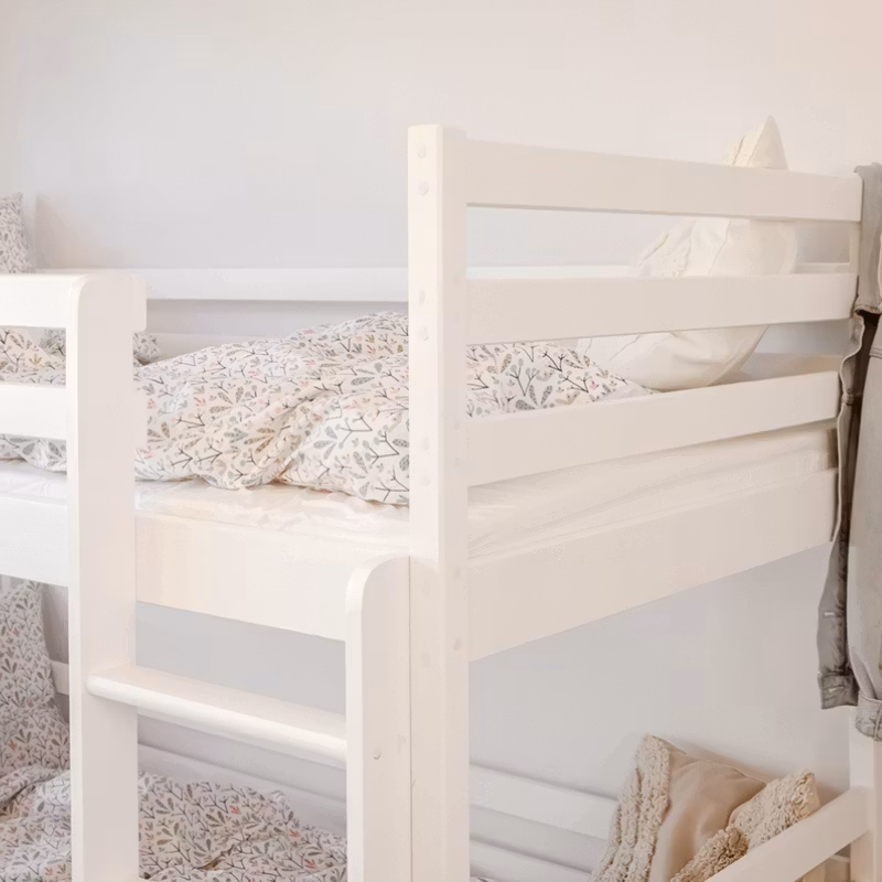 Sengene kommer fra vores fabrik i Europa, som har høje kvalitetskrav og kontrollerer hvert trin fra tømmeret kommer ind på fabrikken, til et færdigt produkt går. Malingen er organisk, vandbaseret og overholder standarden EN 71-3:2019.