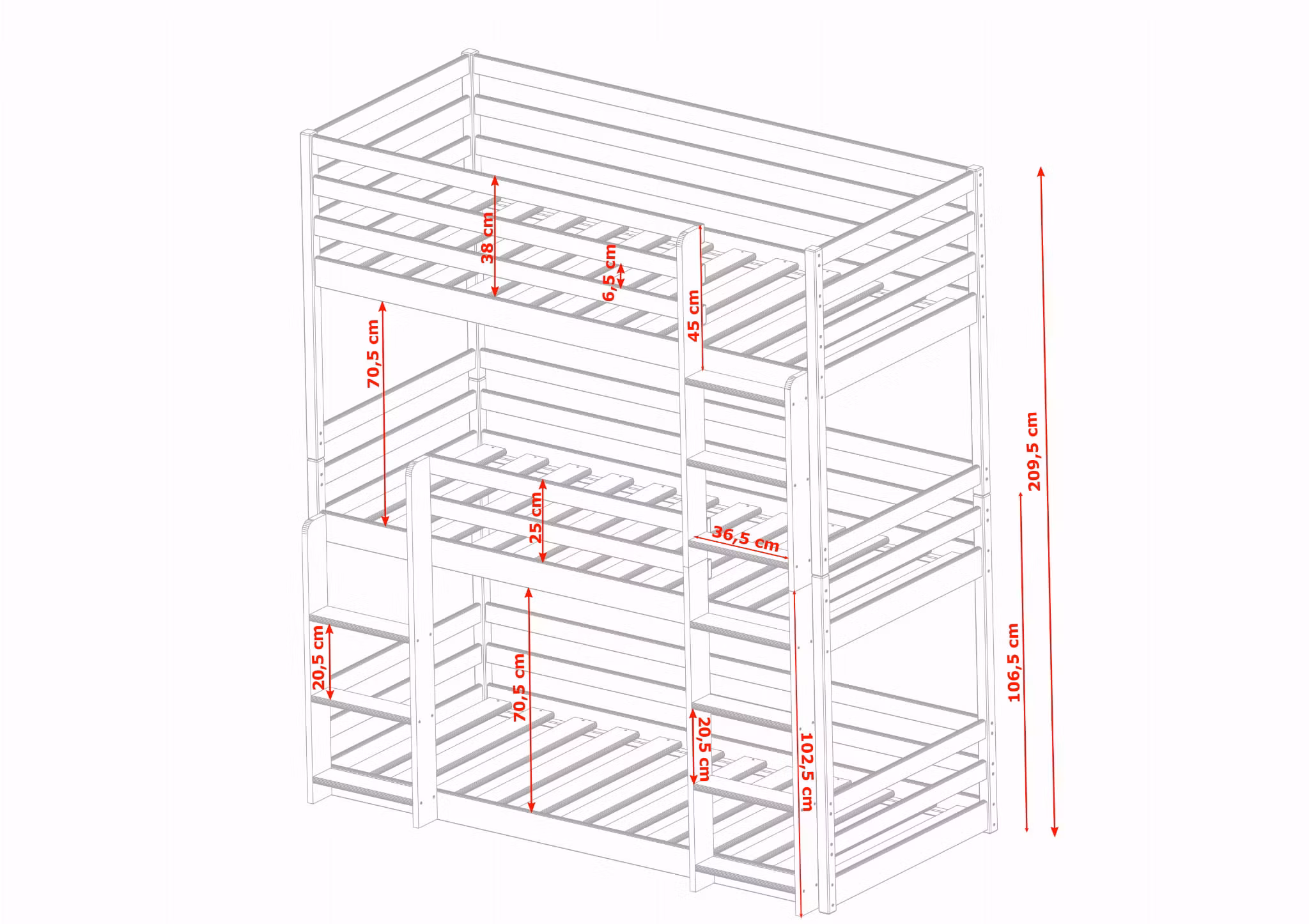 - Højde på gelænderet på den øverste seng: 38 cm.