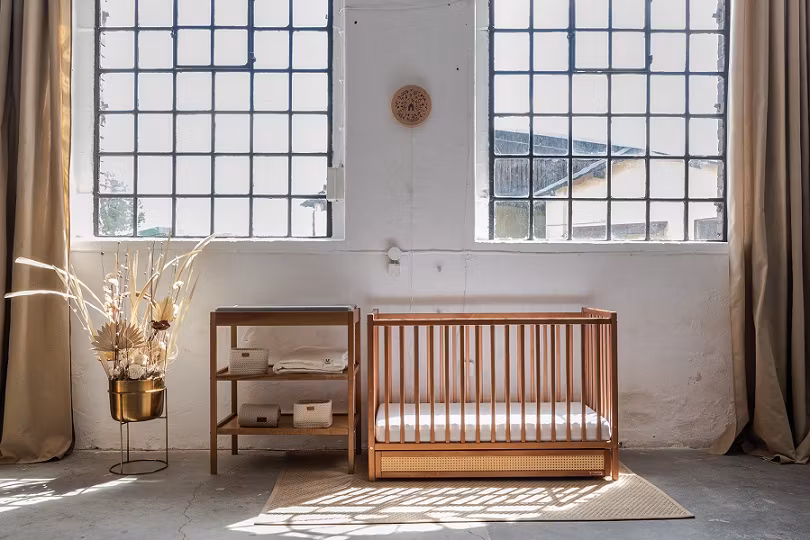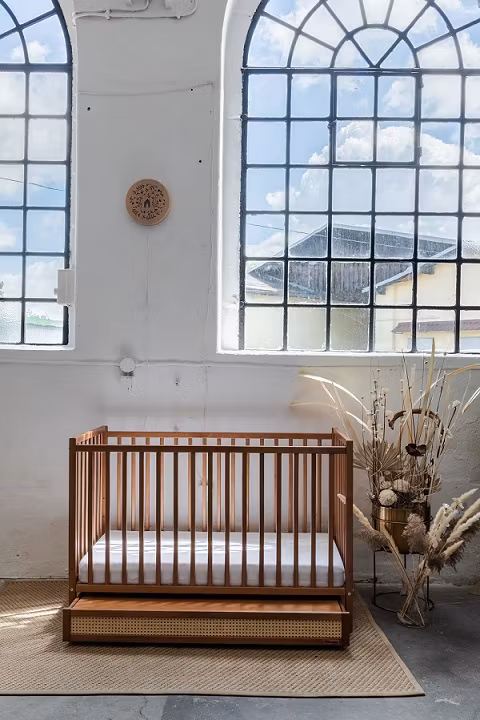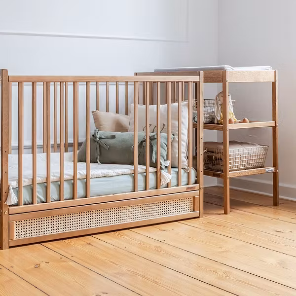 Denne fine tremmeseng kan tilpasses barnets udviklingstrin, blandt andet gennem fire niveauer på sengebunden. Når barnet er stort nok til selv at komme ind og ud af sengen, kan tre lameller også tages af. Unikt og praktisk!