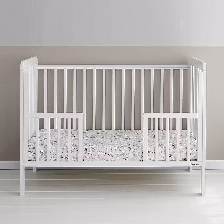Klassisk hvid babyseng, der har et tidløst design og passer ind i ethvert børneværelse.