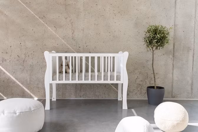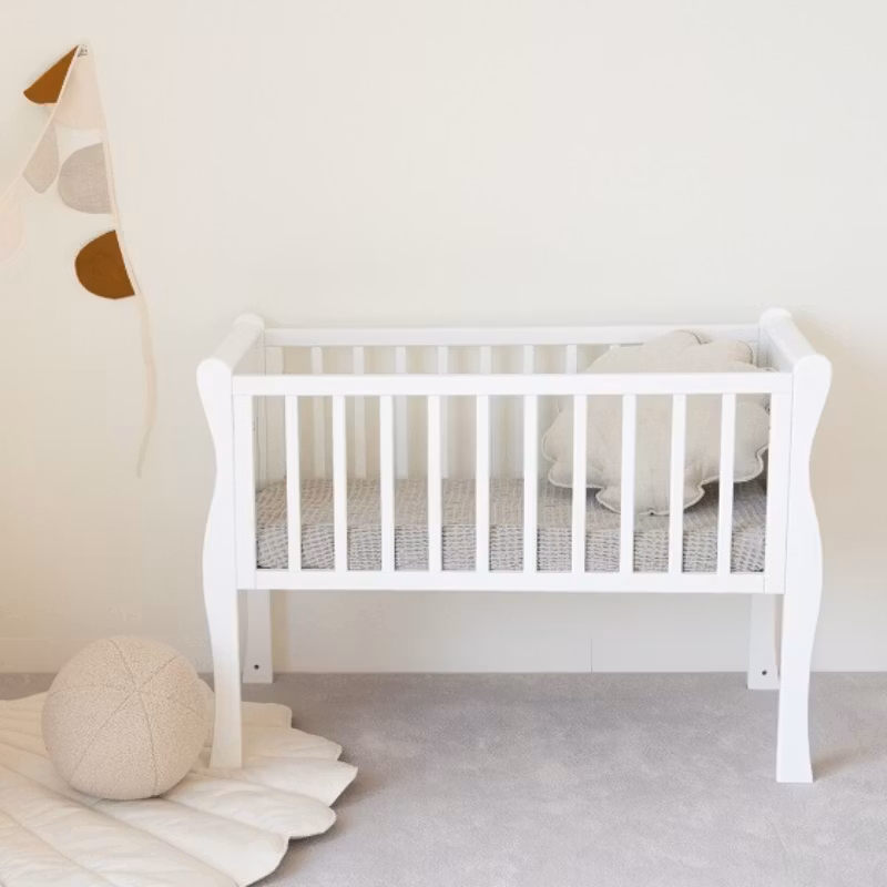 Lækker hvid tremmeseng i retrostil, der er perfekt som babys første seng!
