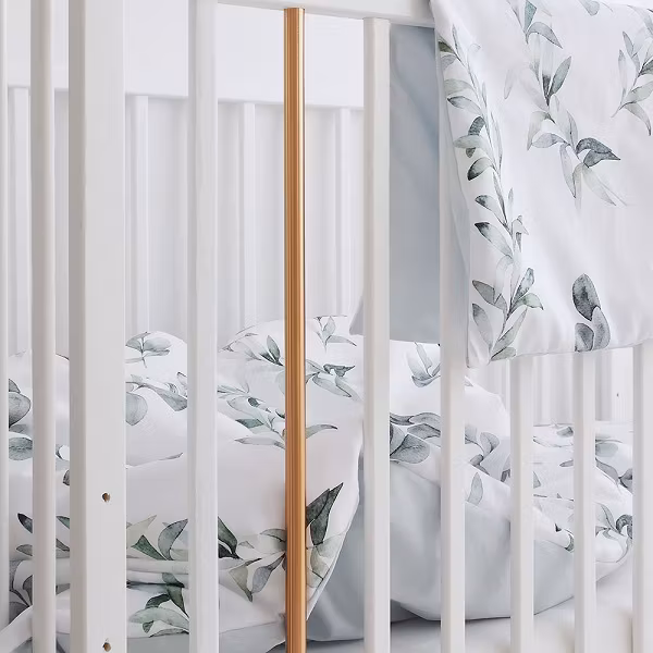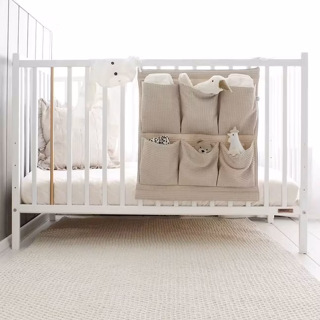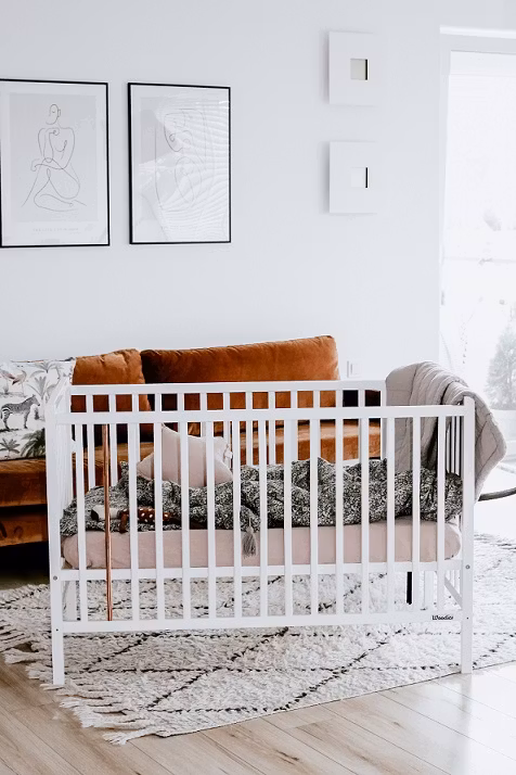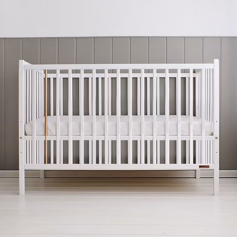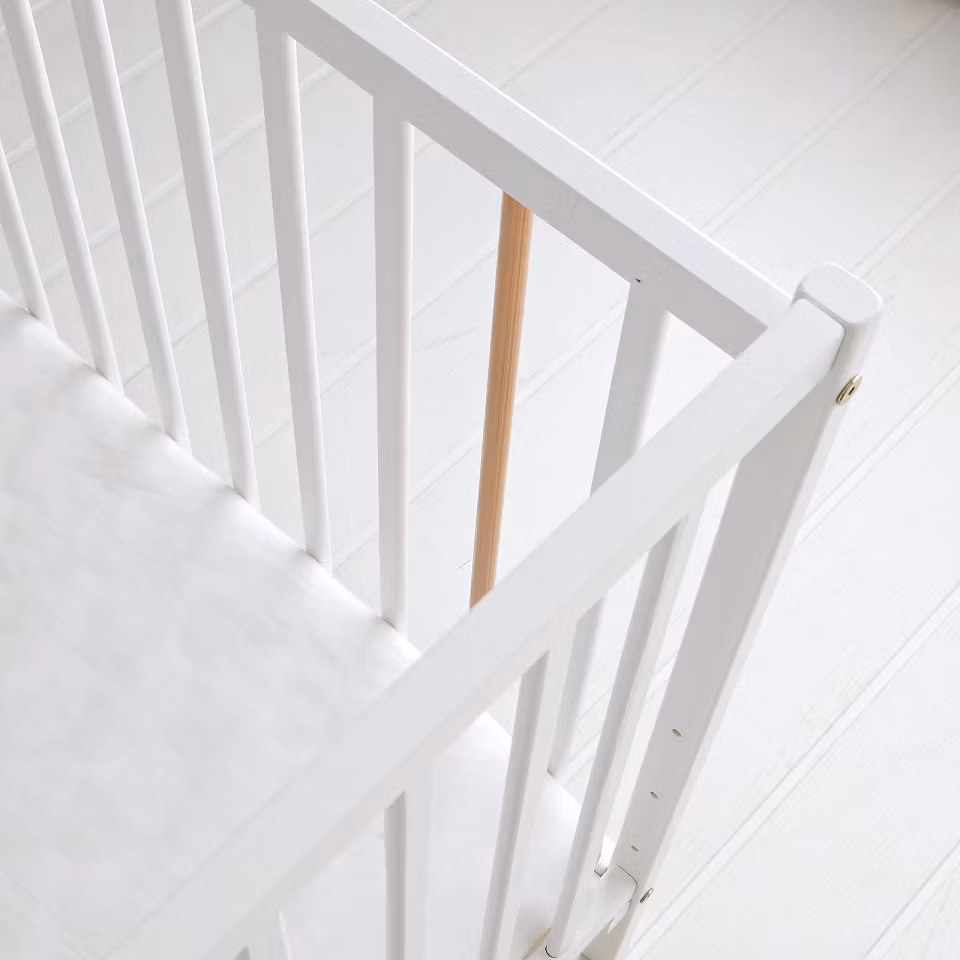 Klassisk hvid babyseng, der har et tidløst design og passer ind i ethvert børneværelse.