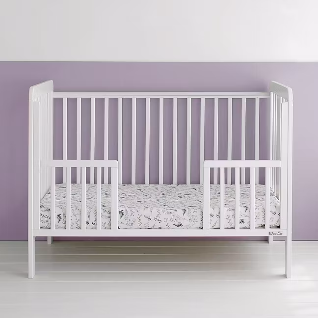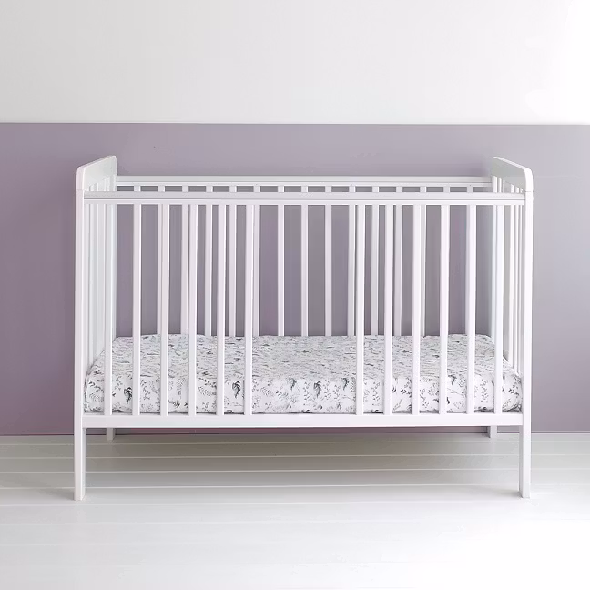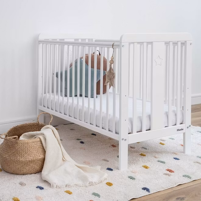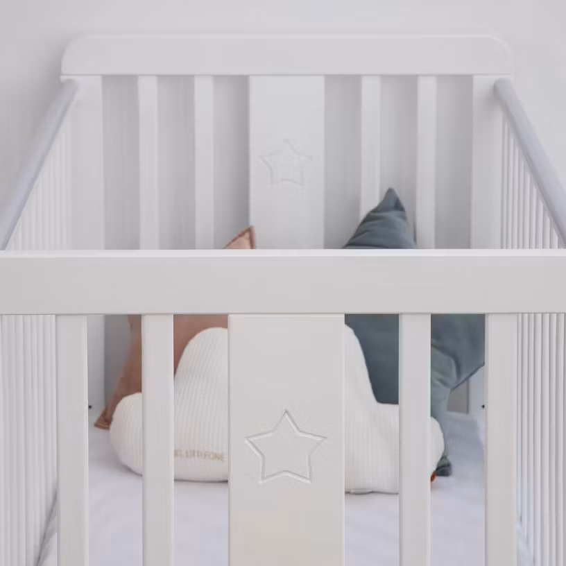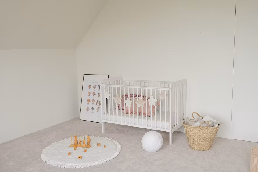 Klassisk hvid babyseng, der har et tidløst design og passer ind i ethvert børneværelse.