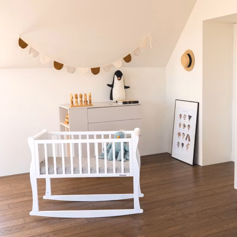 Lækker hvid tremmeseng og vugge i romantisk stil, der er perfekt som babys første seng!
