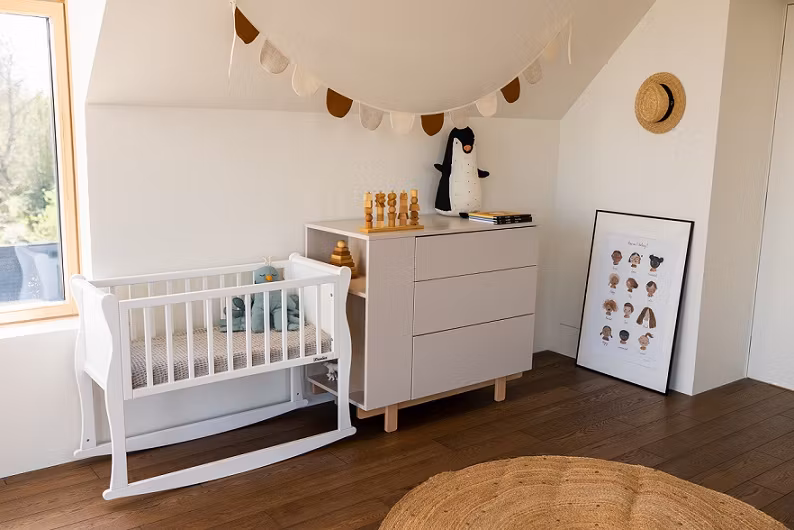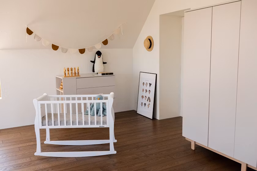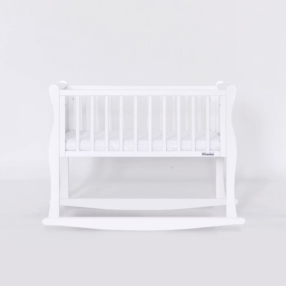 Aftagelige bøjler medfølger, så du nemt kan lave din vugge om til en tremmeseng, hvis du ønsker det. Tremmesengen kan også bruges som bedside crib, som også kaldes en sideseng, og kan placeres både til højre eller venstre for forældrenes seng. Perfekt til mindre rum takket være dens kompakte størrelse.