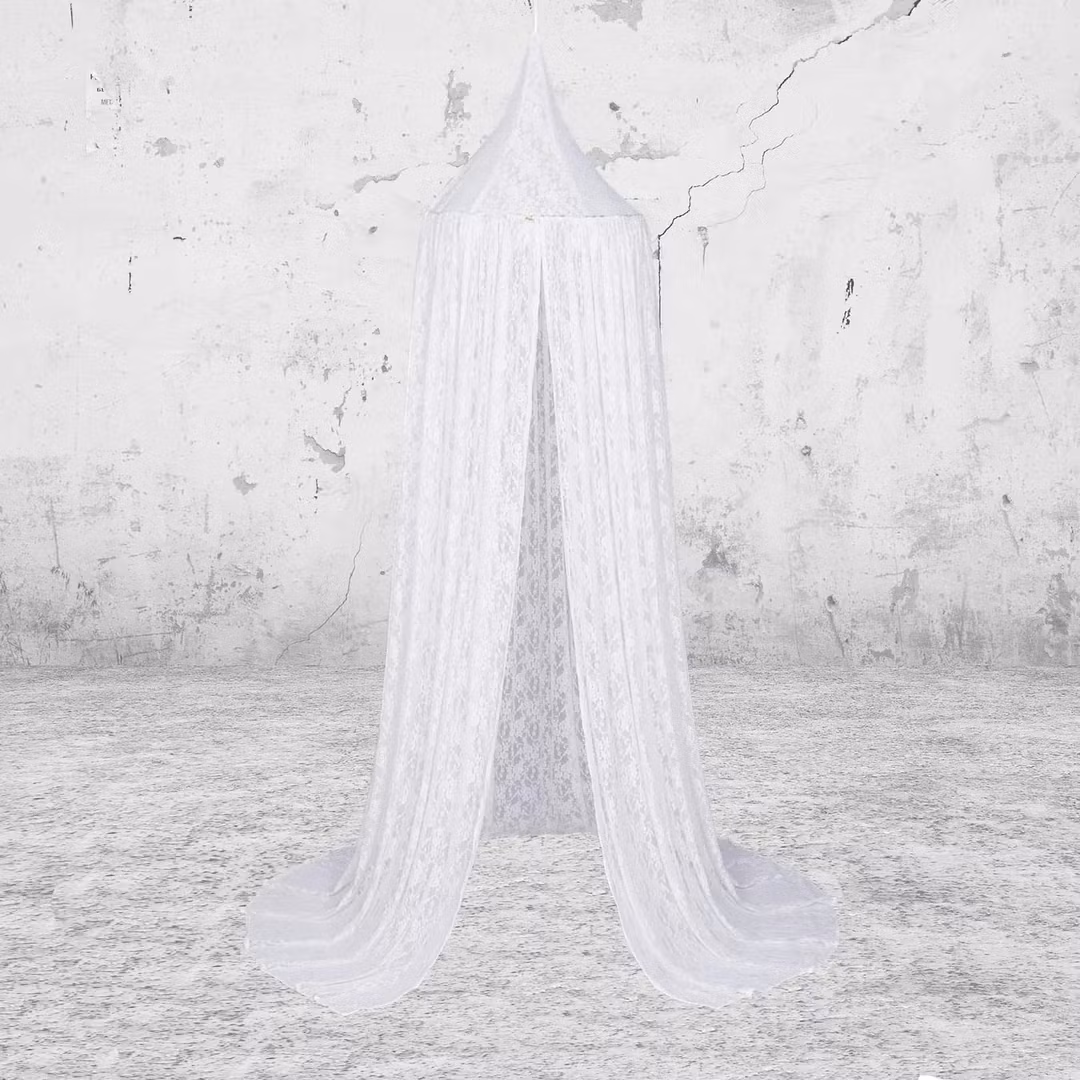 For at montere sengehimmelen behøver du kun en lille krog, som du sætter fast i loftet og derefter hænger sengehimmelen på. Sengehimlens struktur holdes på plads med en aftagelig metalring.