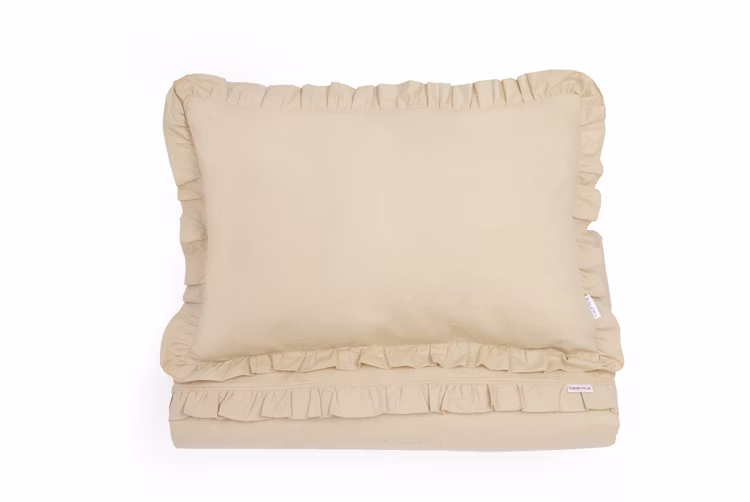Et meget smukt sengesæt af høj kvalitet i afdæmpet farve vil sammen med sine skønne flæser skabe en dejlig stemning i barnets seng og på børneværelset.