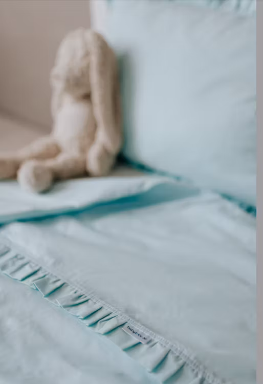 Et meget smukt sengesæt af høj kvalitet i afdæmpet farve vil sammen med sine skønne flæser skabe en dejlig stemning i barnets seng og på børneværelset.