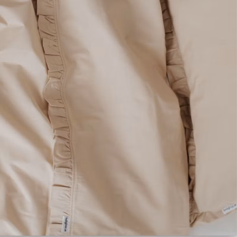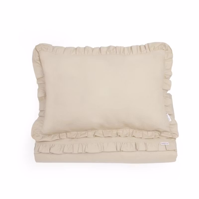 Et meget smukt sengesæt af høj kvalitet i afdæmpet farve vil sammen med sine skønne flæser skabe en dejlig stemning i barnets seng og på børneværelset.