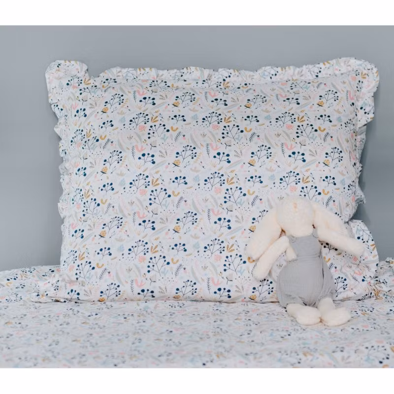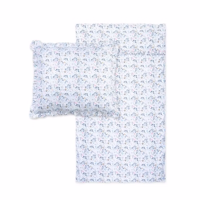 Et meget smukt sengesæt af høj kvalitet i afdæmpet farve vil sammen med sine skønne flæser skabe en dejlig stemning i barnets seng og på børneværelset.