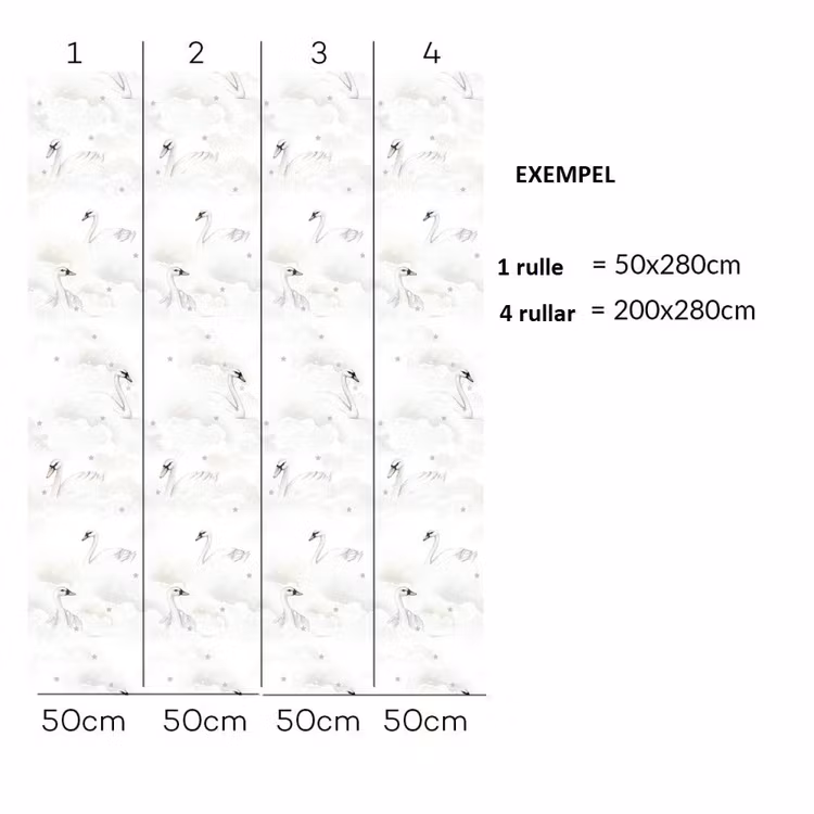 Mål: Tapetet er opdelt i baner (50x280 cm). Du bestiller nemt mål efter dine ønsker og væggens størrelse.